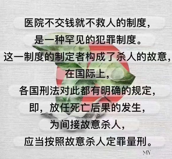 中共国实行的,医院不交钱就不救人的制度,是一种罕见的犯罪制度,是一种故意杀人的制度