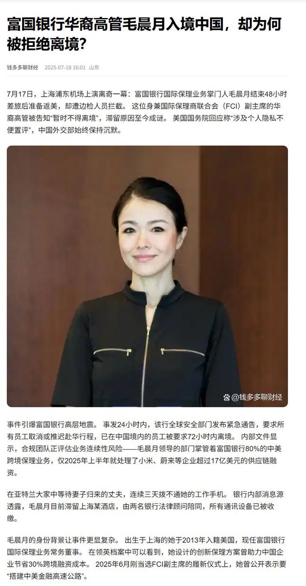 千方百計为中国企业在海外融资提供服务的毛晨月原本是中共官员的座上宾,按说应该由美国政府查查她为中国提供了哪些金融服务,沒想到是中国政府先下手为强,不让她离境。