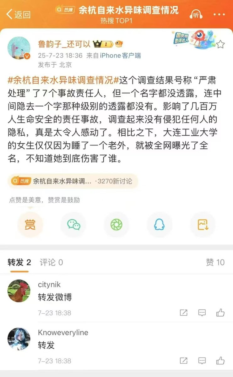 大家发现,天水铅毒和余杭臭水的处理结果里面,所有被处罚者都是隐身的,连个姓都没有。而同时期一个大学女生睡了个老外,名字被无数家媒体报得全国皆知。正可谓:吃屎事小,失节事大。