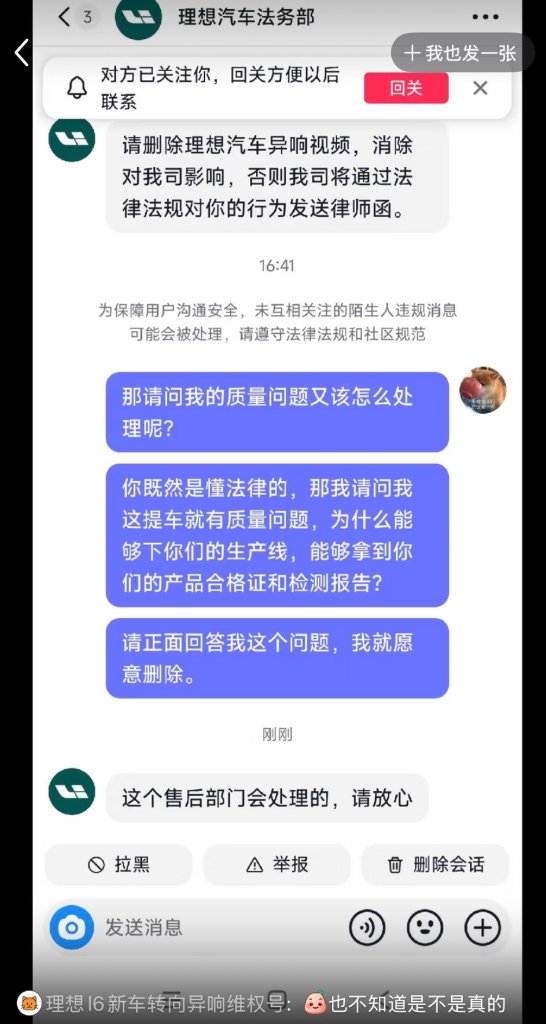 网友投稿7月24日,小红书上一名网友因为发了理想汽车质量问题,被理想法务部私信威胁。随后网友把截图也发了出来。结果二十分钟后帖子被删,连号都被冻结了