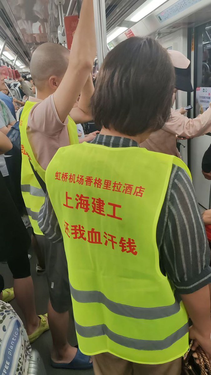 近日 上海一对夫妻在地铁里身穿写着“还我血汗钱”的马甲,只为让全上海人知道这件事,为讨回自己的血汗钱。虹桥机场香格里拉酒店于2020年启动建设,施工单位为上海建工。