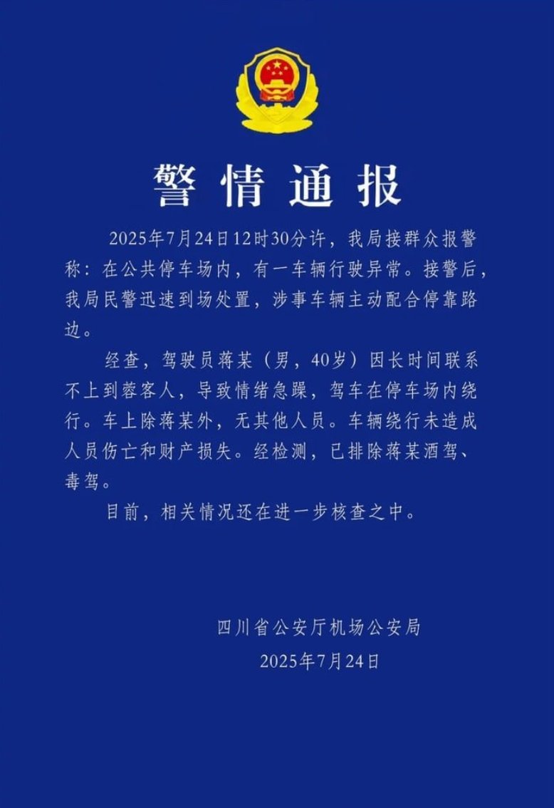 7月24日,四川公安发布警情通报称, “比亚迪机场绕行事件”并非车辆故障,而是系驾驶员蔣某(男,40岁)因长时间联系不上到蓉客人,导致情绪急躁,驾车在停车场内绕行。