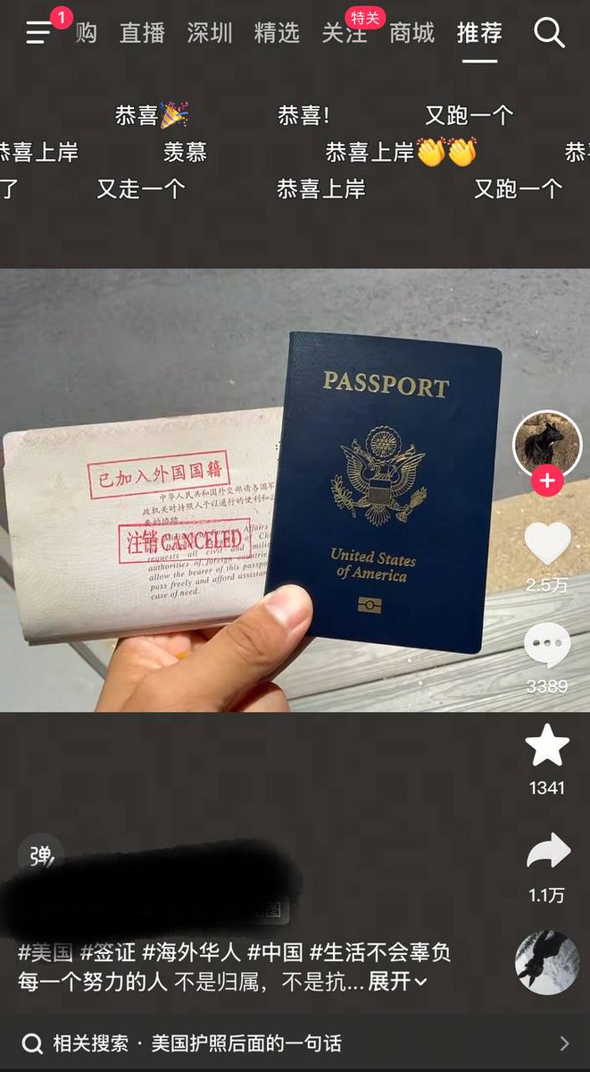 近日 抖音一条注销中国国籍,手持美国护照的视频,被网友刷屏“恭喜上岸”。不少网友评论:这才是真正的上岸。还有人直言到:“以前看见这个我高低给喷两句,但是现在的我病好了”该评论获得大量点赞。