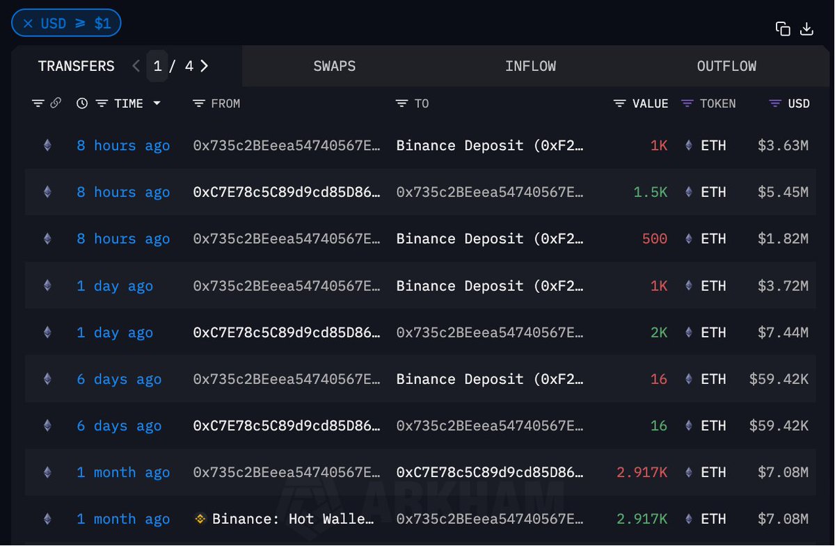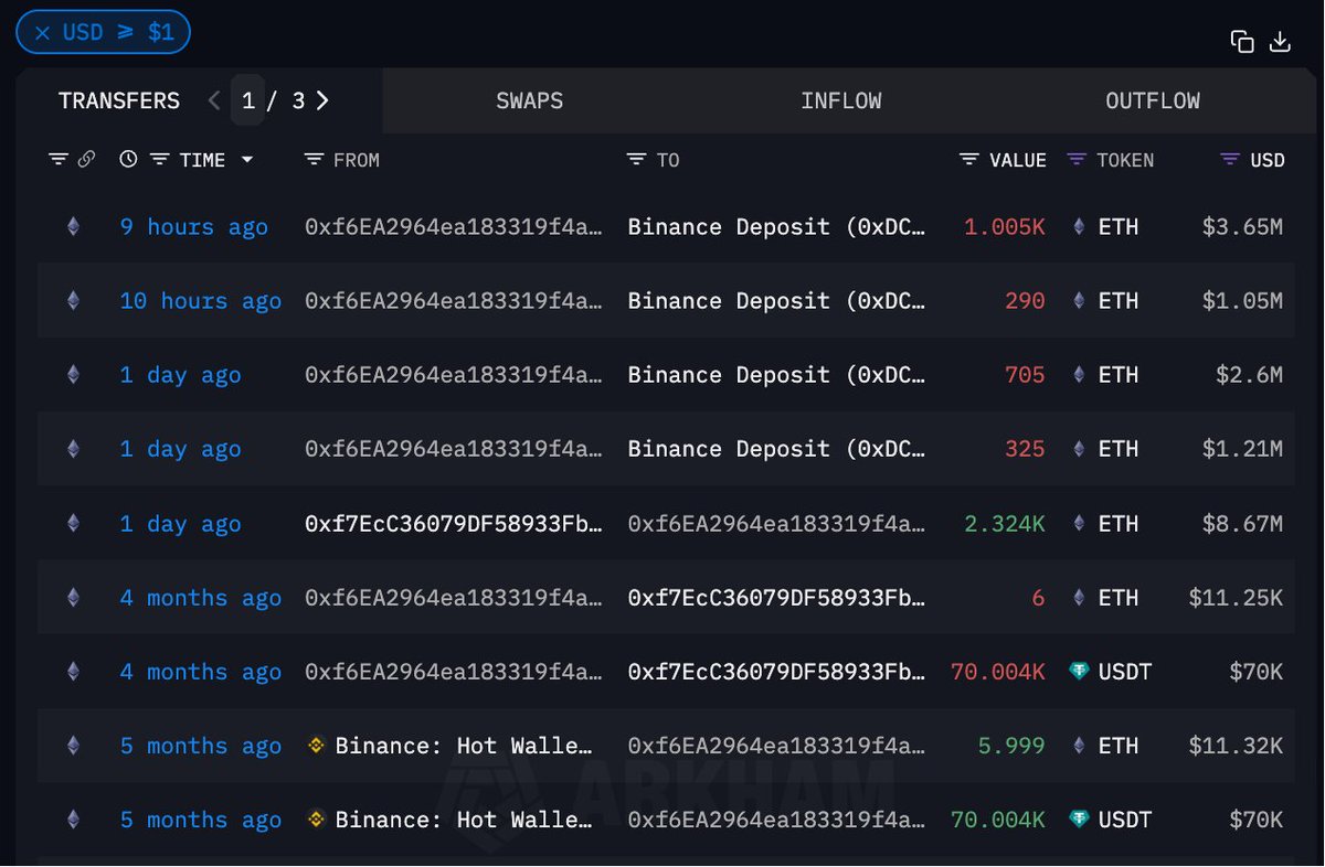 疑似归属于同一人的两个地址过去 10 小时抛售 3810.76 ETH,价值 1392 万美元,若卖出将获利 269.3 万美元💰两个地址都是在 2024.10 - 2025.06 期间囤积的 ETH,平均成本分别为 $2940 和 $2977;从昨天开始分批抛售,目前已累计向交易所转移 5,540.76 ETH,约 2009 万美元钱包地址