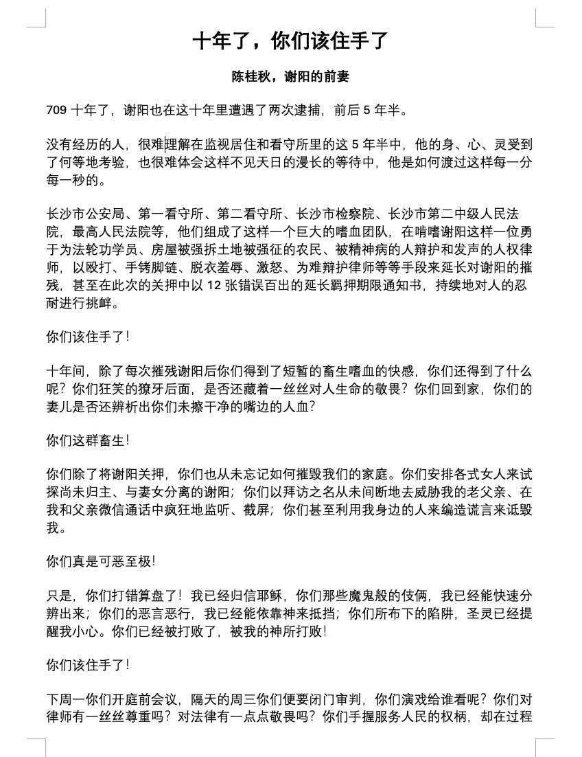 709十年了,谢阳也在这十年里遭遇了两次逮捕,前后5年半。
