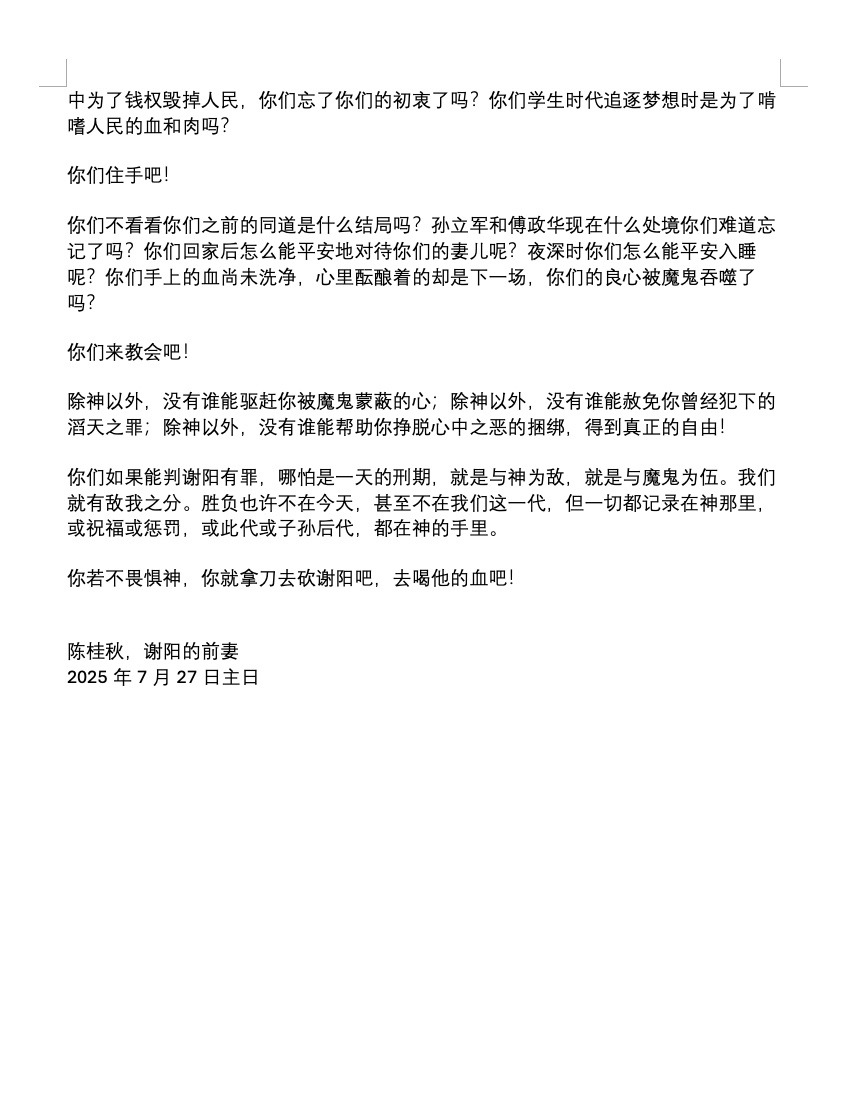 你们除了将谢阳关押,你们也从未忘记如何摧毁我们的家庭。你们安排各式女人来试探尚未归主、与妻女分离的谢阳;你们以拜访之名从未间断地去威胁我的老父亲、在我和父亲微信通话中疯狂地监听、截屏;你们甚至利用我身边的人来编造谎言来诋毁我。