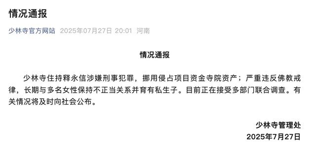 中午刚辟谣,现在坐实了。中国新闻周刊:少林寺住持释永信涉嫌刑事犯罪,挪用侵占项目资金寺院资产;严重违反佛教戒律,长期与多名女性保持不正当关系并育有私生子。目前正在接受多部门联合调查。有关情况将及时向社会公布。怎么像纪委处理官员的纪律通报。