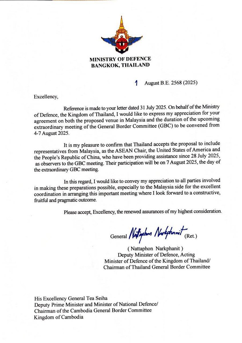 Thailand accepted Cambodia’s proposal to include representatives from Malaysia, the United States, and China as observers to the General Border Committee (GBC) meeting.