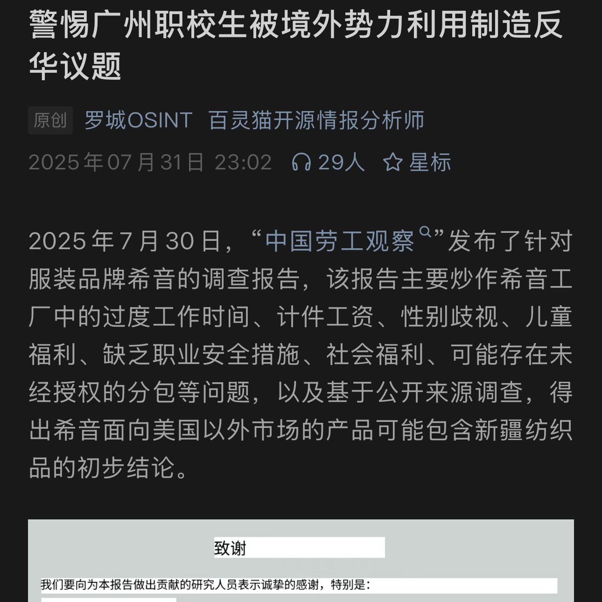 7月31日 一微信公众号发布文章《警惕广州职校生被境外势力利用制造反华问题》,将一个致力于揭露血汗工厂的摄影小组,打上“境外势力”标签。网友评论:“不去讨论工人处境的问题,而是强调“境外势力”“干扰社会”,让普通人觉得这个组织动机不纯。这种选择性叙述,就是“真相被加工””