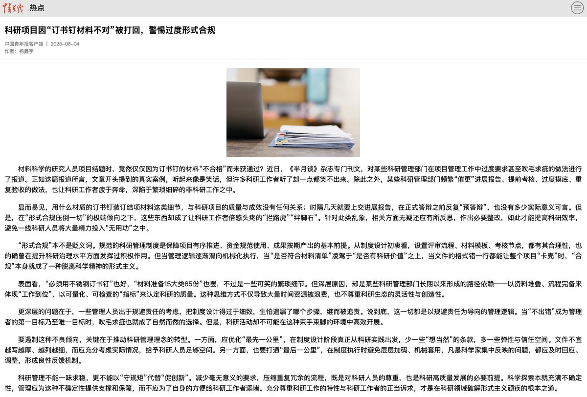 中国对于科研的审慎与苛刻甚至已经渗透到了订书钉的材料。8月4日 多家媒体报道,中国一材料科学研究人员在项目结题时,因未使用不锈钢订书钉,被科研管理部门审核为未通过。