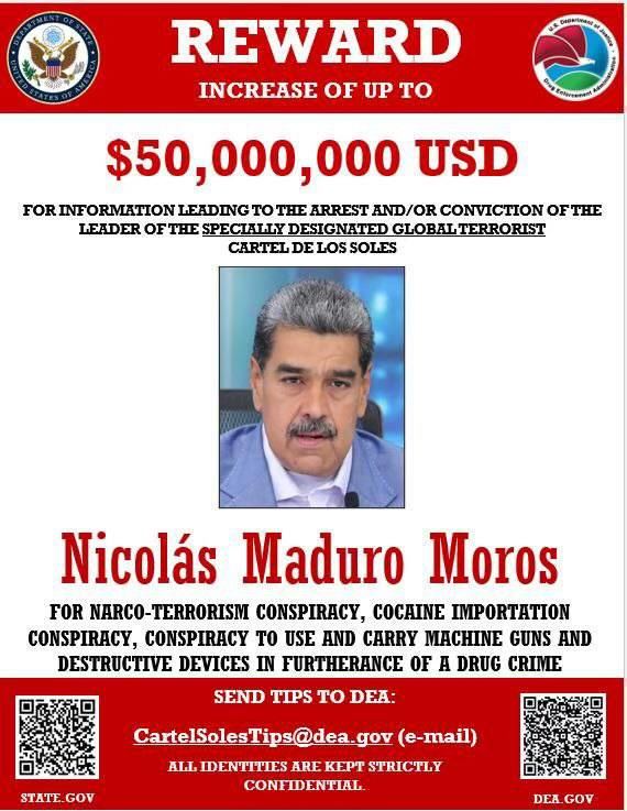 BREAKING: The United States increases reward leading to the arrest of Venezuela's Nicolas Maduro to $50 million