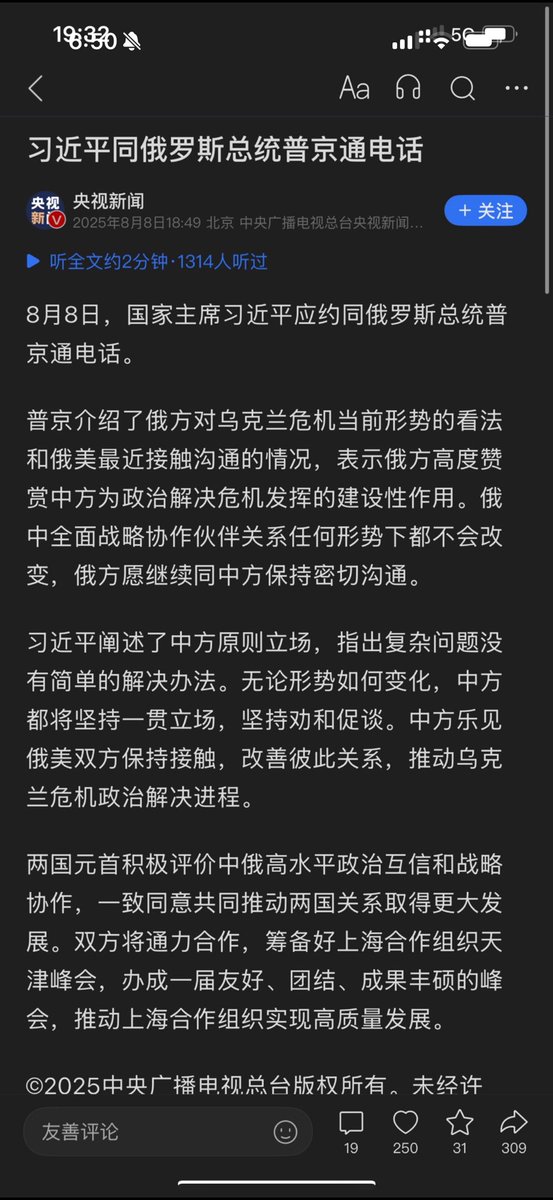 俄乌战争要停下来恐怕很不容易,川普和普京下周能不能见面都存在着很大的不确定性,普京的底气主要是来自中国和印度,面对川普的关税大棒,莫迪紧急派人前往莫斯科见普京,并且宣称本月底去北京见习近平,这就意味着美国主导的印太战略土崩瓦解,前天巴西总理卢拉呼吁所有金砖国家达成共识去美元化应对美国的关税制裁,再加上普京在跟习近平通话中,很明显得到习近平的支持,俄乌战争打到现在,以俄罗斯的经济体量,沒有中国大规模的资金支持和军事物资援助,俄罗斯早就鸣锣收兵了。下周川普会能否順利进行,取决于普京是否愿意退让,也取决于中印是否继续购买俄罗斯的原油和天然气。