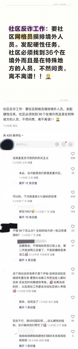 小红书上,有网友称:社区反诈工作 要求网格员摸排境外人员,并发配硬性任务---社区必须找到36个在境外而且是在特殊地方的人员,否则问责。