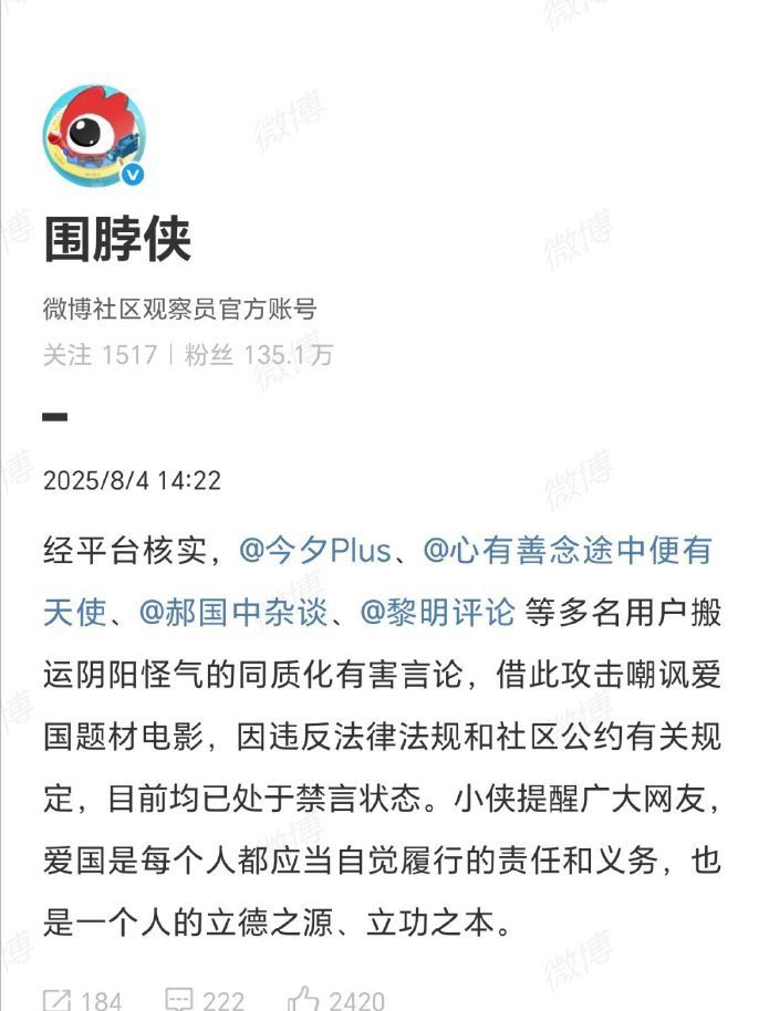 多名博主因为阴阳怪气爱国电影被封禁你以后还敢嘲讽战狼,和吴京叔叔吗?😡😡