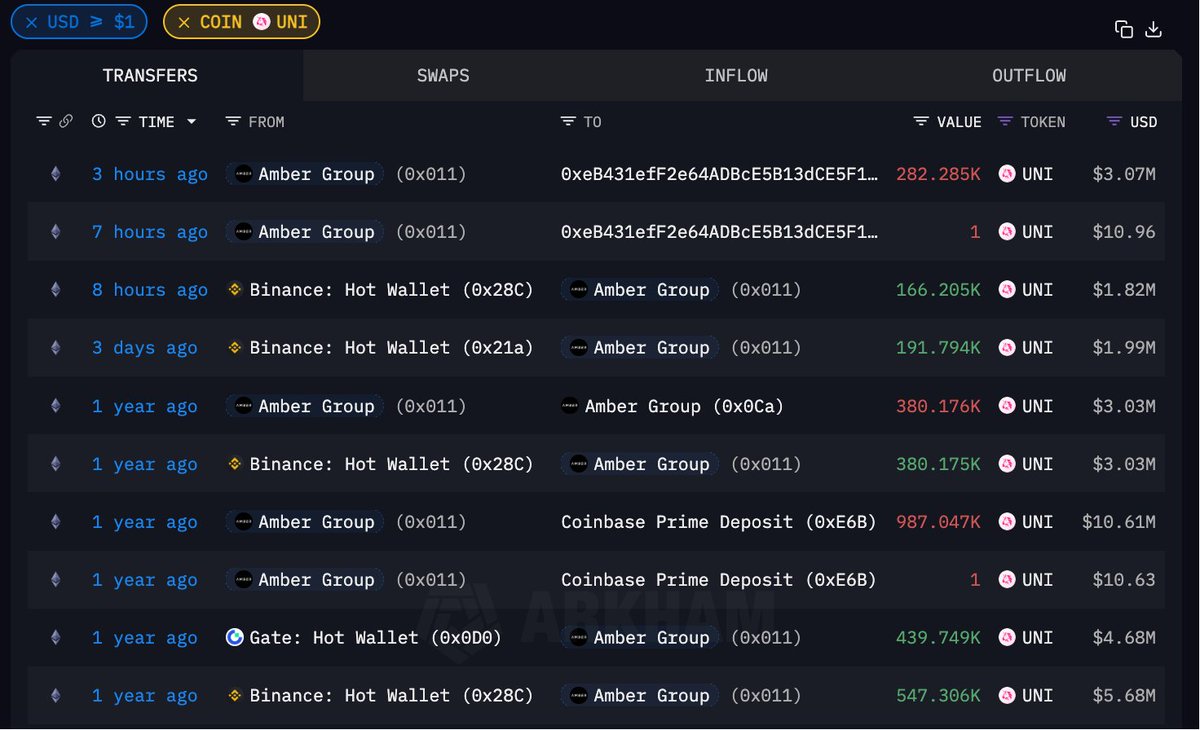 近三天 Amber Group 累计从 #Binance 提出 35.8 万枚 UNI(约 381 万美元),平均提出价格 $10.64,现已浮盈 23 万美元🦄距离 Amber 上一次大额从交易所提出 $UNI 已有一年多的时间了,目前部分代币已被转移至新地址 0xeB4...CD0E5钱包地址