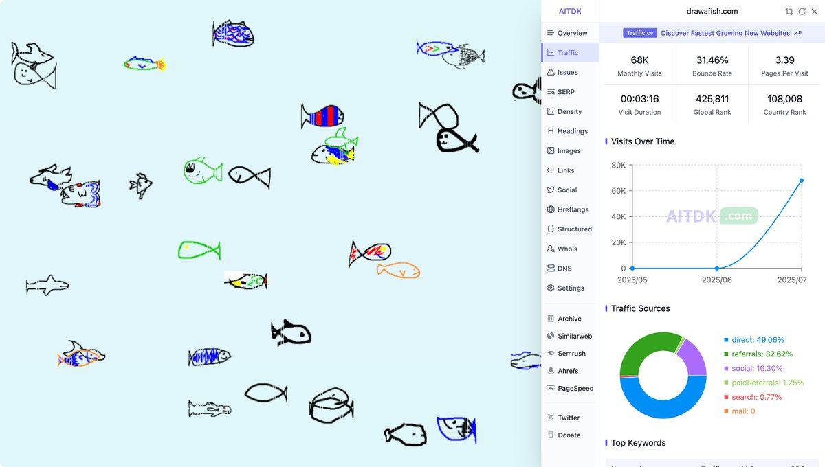 🤣 笑死了,这个网站作者脑洞有点大作者开发了一个网站,可以画一条鱼 🐟 并看它游泳,发到 reddit 和 Hacker News 后,来了很多人在上面画鱼、看游泳域名 2025-6-30 注册,7 月份流量 68K,最近 28 天流量已经达到 214K真是思维打开,万物皆可做成网站