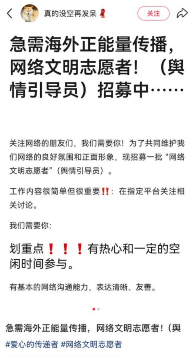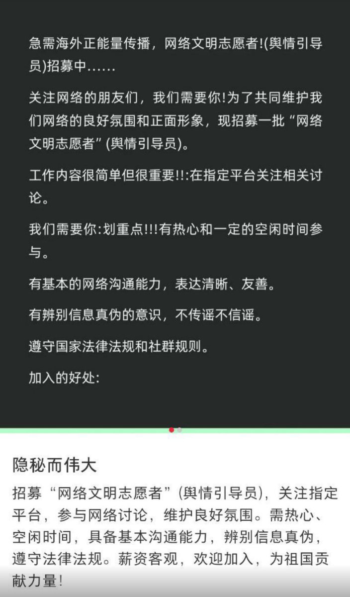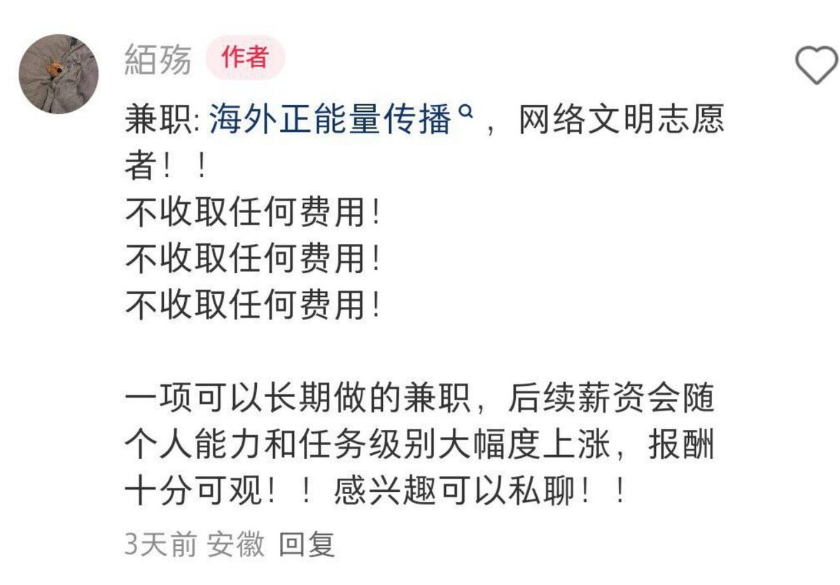 目前,在社交媒体上出现一些招募“海外正能量传播志愿者、舆情引导员”的广告贴。工作是在指定平台参与相关讨论,一贴5元左右。