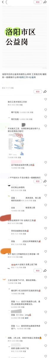 8月8日,河南洛阳,网友发帖询问:“洛阳市区的公益岗待遇怎么样?工资会拖欠吗?辅助岗一般都做什么?” 评论区瞬间涌现大量抱怨: — IP河南:工资已经拖了4个月,还可能继续拖,最恶心的是医保、社保都没交。 — IP河南:洛阳市涧西区,2月份上班,到现在工资数额都不清楚。 — IP河南:扣除社保后到手1700元,也会拖欠工资。 — IP河南:干的活和在编一样,也照样拖欠。 — IP河南:我们工资才发到三月份。 — IP河南:不仅拖工资,社保部分还得自己垫付。