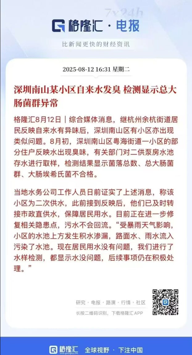 8月12日,深圳南山某小区居民反映,自来水出现异味。检测结果显示菌落总数超标,总大肠菌群、大肠埃希氏菌不合格。官方称系暴雨致冰池渗漏、雨水流入污染所致,已改为市政直供水,并进行修复。此前杭州也曾曝出类似问题。