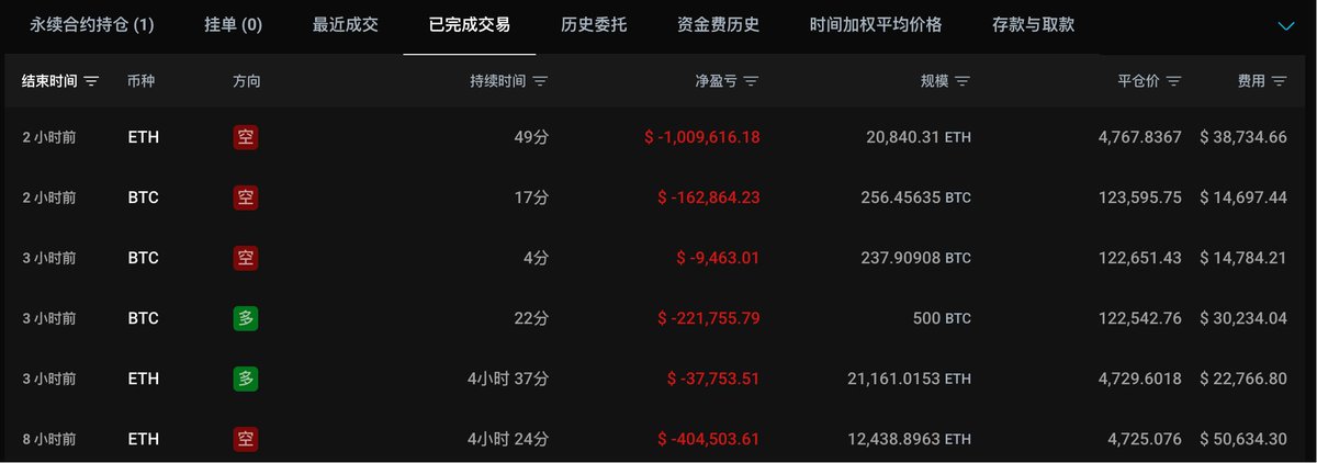 8 小时,6 个仓位,胜率 0%,亏损 184.6 万刀哥,你要不歇会呢😅 AguilaTrades⁩ 凌晨一通操作覆盖了 $BTC 和 $ETH 多空两个方向,连跪六次之后目前开启了 ETH 25x 多单,持仓 21050 ETH(9993 万美元),开仓价格 $4,750.06传送门: