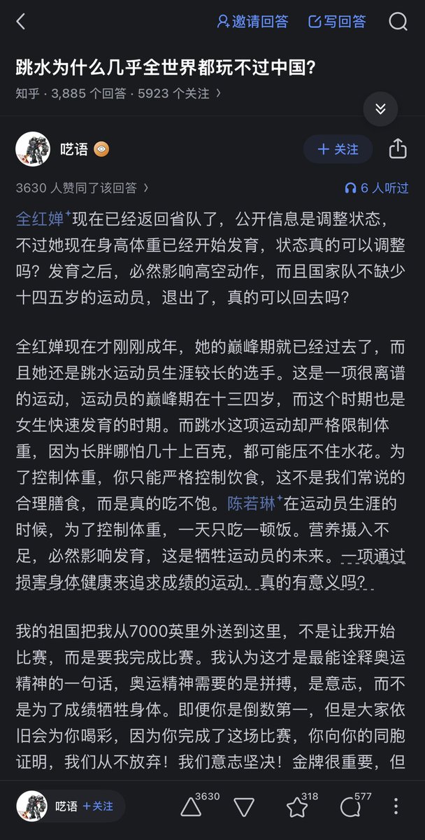 原来跳水运动员讲究的是在身体发育完全之前控制营养,限制发育,控制体重,压住水花。。。 咋就是咱们跳水运动能问鼎冠军,而其他各个经济条件更好、跳水历史更悠久的国家,做不到的根本原因 这让我想到了朝鲜的人肉LED显示屏 看来咱们党国为了国家荣誉,为了自己的荣光(当然也包括一群所谓爱国者的自尊心和喝彩), 的确真的是惨绝人寰,的确是没有把任何一个中国人当人在看 和这样一个国家产生联系 确实让我感到,由衷的、全身上下、由内而外 生理性的恶心