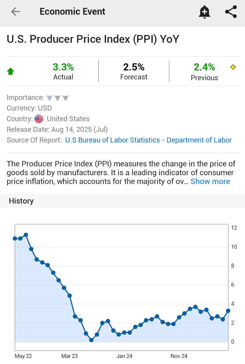 美国的7月份生产者价格指数(PPI)出炉了:同比增长3.3%,远高于预期的2.4%。这一次不知道又要开除谁?核心PPI(去除食品和能源)的增幅达到3.7%。一般来说,PPI的变化会有2-3个月时间反映到物价上。美国人民会感觉到痛的。特朗普不承认这是他乱打王八拳的结果,只会怪罪劳工部统计局或者美联储。