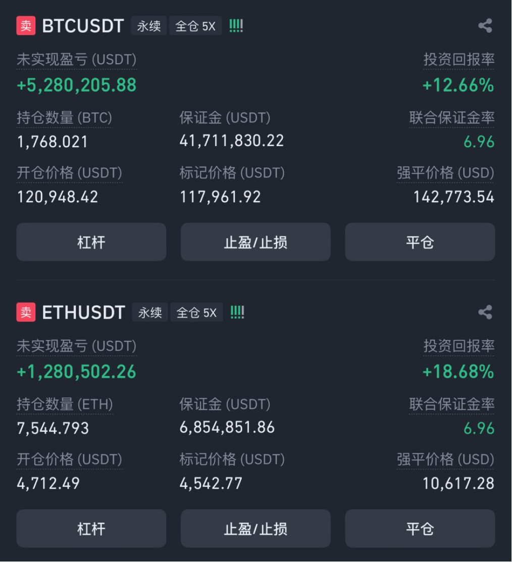 第四次出手👊🏻 「先定 10 个大目标」老哥 @Jason60704294 已于高点开空 $BTC & $ETH ♦︎ BTC:开空点位 $120,948,持仓 1768 枚,现浮盈 398 万美元 ♦︎ ETH:开空点位 $4712.49,持仓 7544.79 枚,现浮盈 74.3 万美元 如果没有止盈,当前仓位累计浮盈达 472.3 万美元;原推传送门 👉 https://t.co/Kamji4AAq2