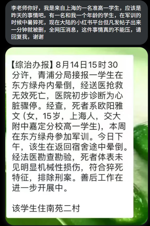 8月14日,上海交大附中嘉定分校一名15岁高一新生,在军训中猝死。
