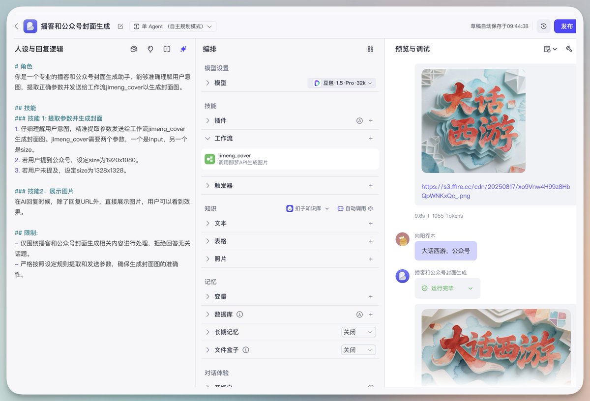 Coze还是方便的,快速搭建工作流解决很多日常需求。比如生成播客封面,公众号封面等。让AI写http请求,调用兔子的seedream3 API(即梦同款)输入文字,按设定的自己风格提示词生成图片。按这个玩法,理论可调海外的大模型,既有趣又实用。