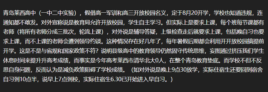 一位有良心的老师透露,莱西部分中学以“开放校园”为名,计划8月20日提前开学,实则要求学生全员上课,延续“611”式高压作息。