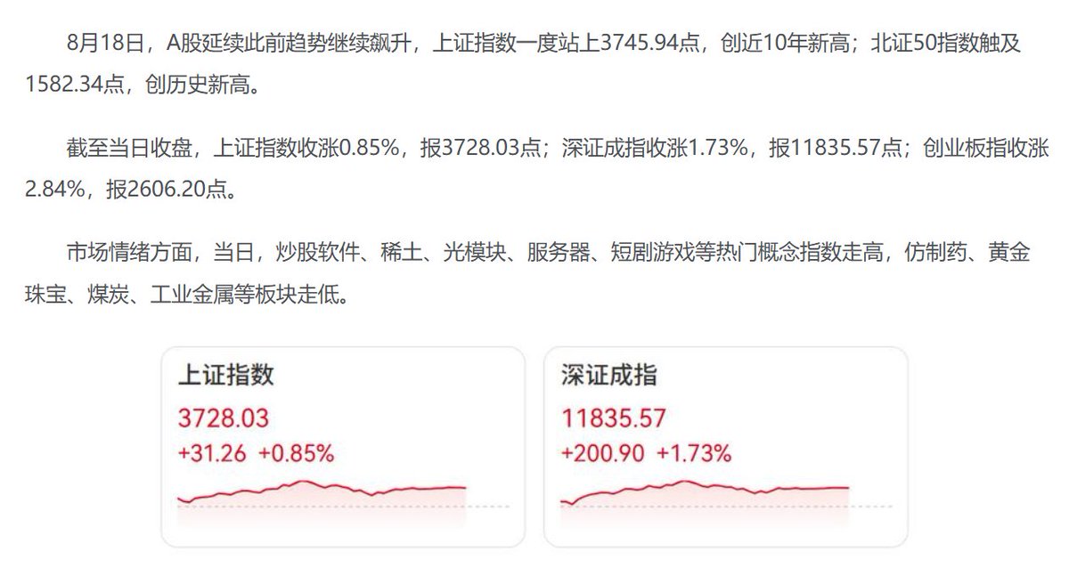 8月18日,上证指数盘中最高达到3759.1点,突破了2021年2月曾触及的3731.69点高点,创下自2015年8月之后十年来的新高。