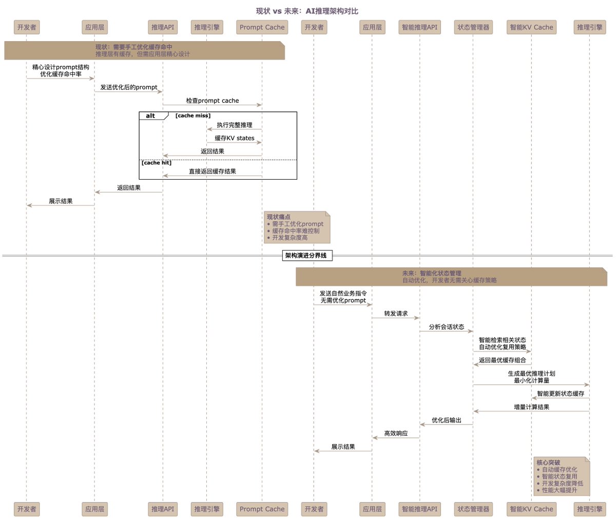 在 ChatGPT 刚出来还没有 API 的时候,我以为聊天会话是有状态的有记忆的,后来 API 出来才发现完全是无状态的,每次都要把历史记录叠加发过去,很反直觉。包括现在 Claude Code 这样的 Agent,也需要依赖每次发送历史记录来维护状态,如果推理层有状态,是能减少很多 token 传输的。