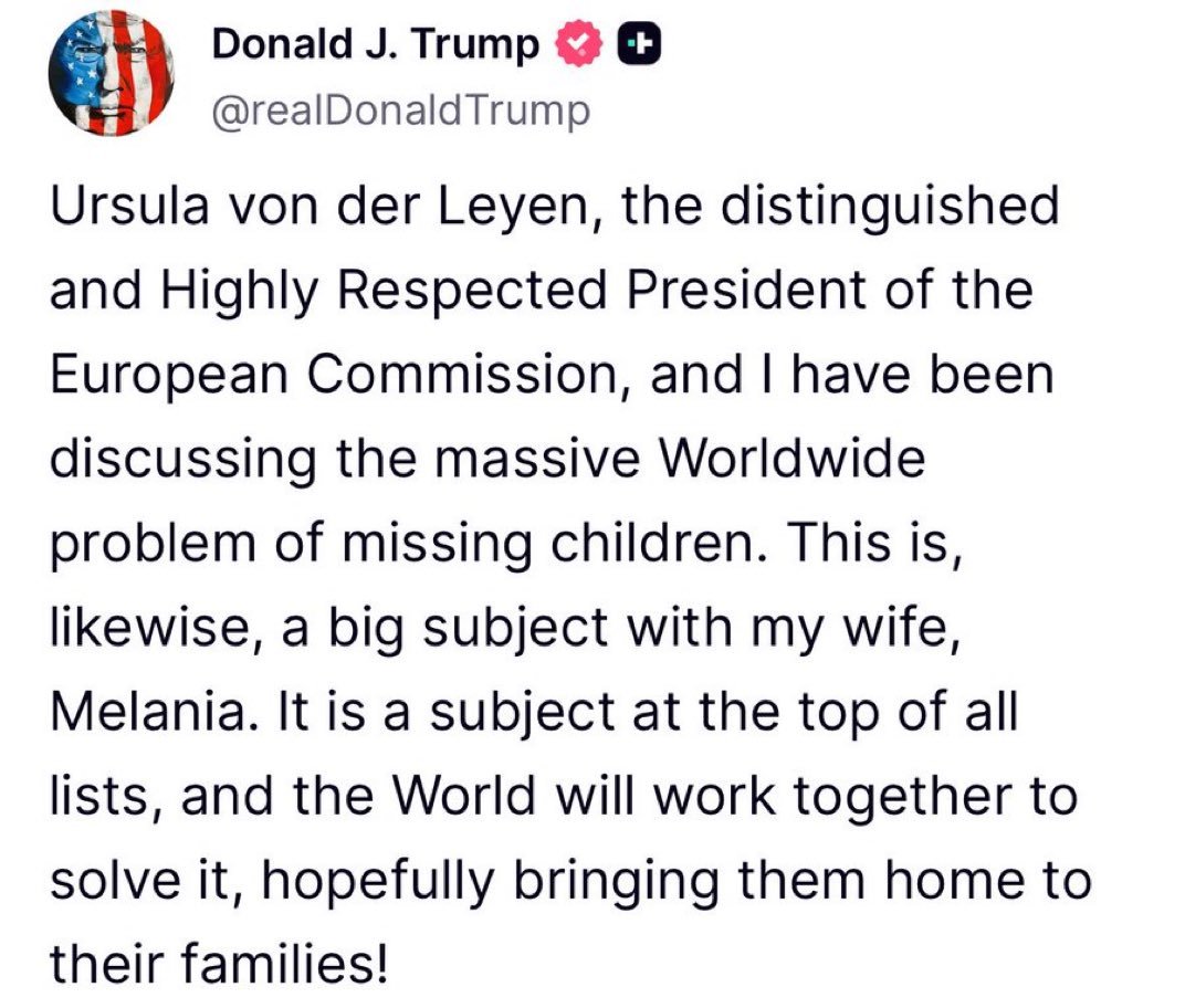 BREAKING: Trump says he has been discussing the problem of missing children with President of European Commission Ursula von der Leyen