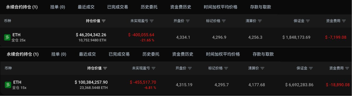 距离清算还有 43 美元!⚡️「12.5 万美元滚仓赚到 53.92 倍的新晋合约之子 」三小时前再次加仓,目前 $ETH 多单持仓 34,121.49 枚(约 1.46 亿美元),且两个仓位均处于滚仓状态🔹地址 0xd076...27bb:持仓 23,368.54 ETH,开仓价 $4,315.19,清算价 $4,177.68,还有 123 刀空间🔸地址