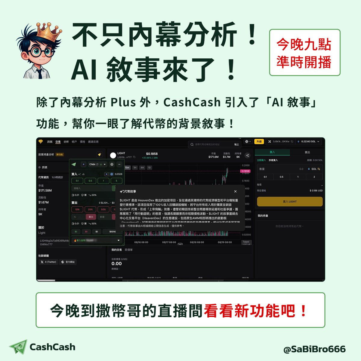 CashCash 不只更新內幕分析 Plus!插件全面升級,新增「AI 敘事」功能🔥幫各位在交易時能一目了然代幣背景今天晚上九點 會直播使用插件各個新功能!好奇要怎麼使用的觀眾們,千萬不要錯過!