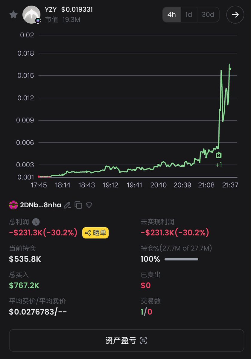 花 76.7 万美金博一个诈尸 Meme 起飞的概率?🤯地址 2DNb2...f8nha 18 分钟前花费 4207.9 SOL(约 76.7 万美元)单笔买入 2770 万枚 $YZY (一个侃爷概念 Meme),导致 K 线直接向上插针,成本 $0.02767,目前浮亏 23.1 万美元钱包地址: