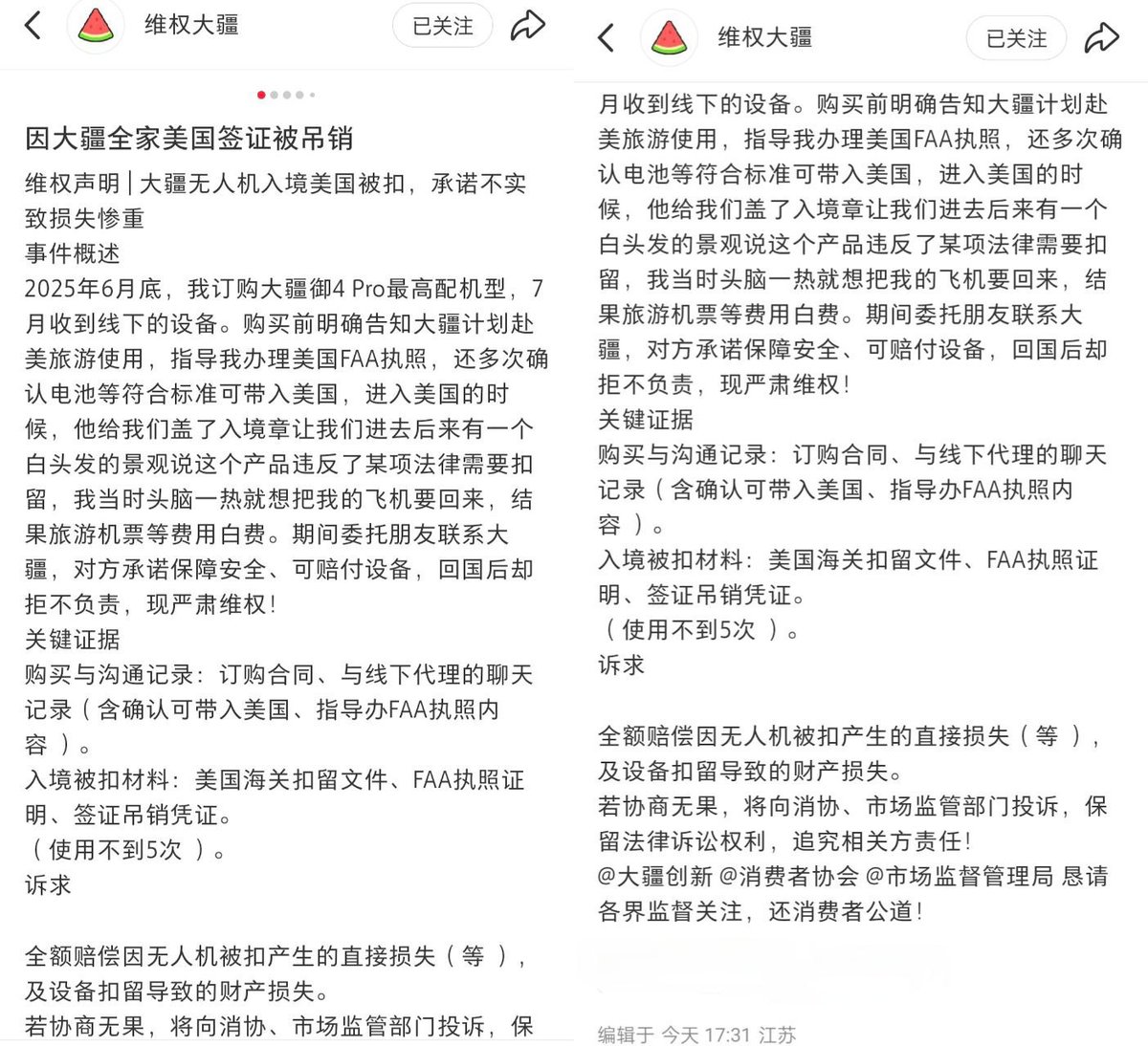 8月19日,江苏,网友发帖吐槽:因大疆全家美国签证被吊销。他自诩购买大疆御4