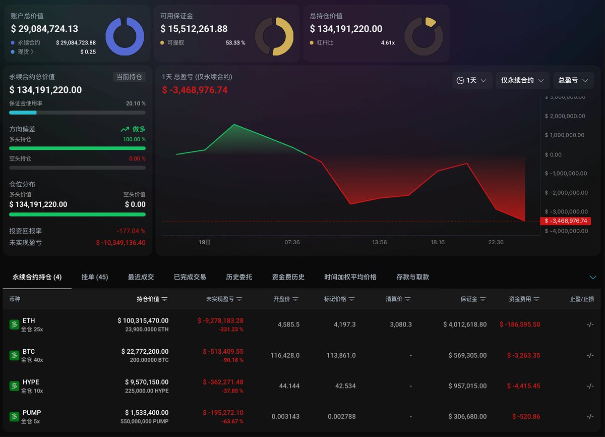麻吉老哥爆仓了?不存在的😂清算价在 $3081,钞能力使得他还有很大的空间;不过他将止盈止损区间调整为 [$4242 - $4800] 了,因此这波下跌可以看到部分 ETH 多头仓位已触发止损目前 BTC / ETH / HYPE / PUMP 多头仓位累计浮亏 1035 万美元;传送门 👉