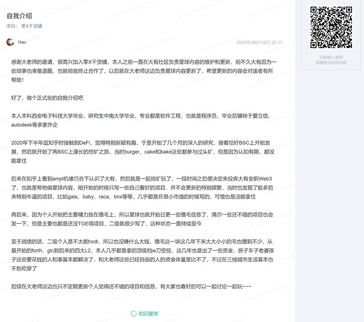 邀请了   加入干货铺输出内容,Hao哥干货非常多,输出很牛逼,主要是Defi上,很多人跟着他赚钱了。