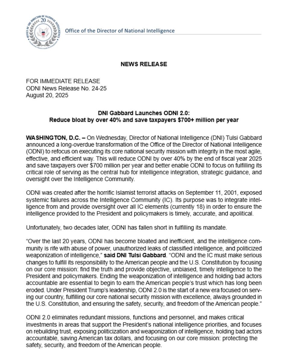 BREAKING: Director of National Intelligence Tulsi Gabbard announces overhaul of the department, cutting over 40% of staff.