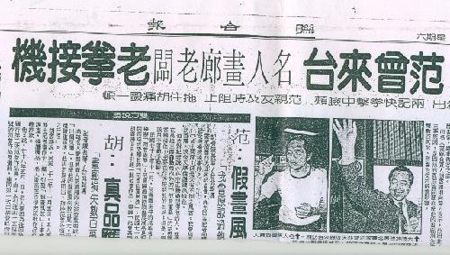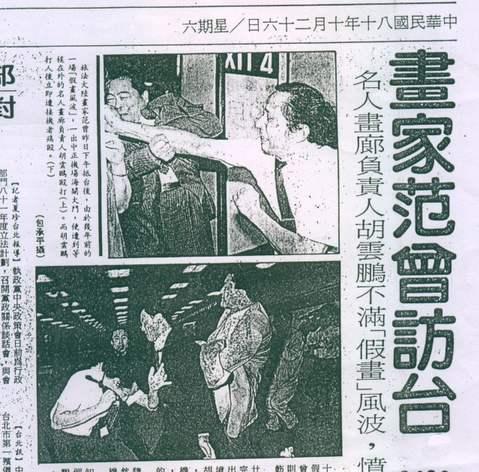 “范曾昨日来台,一下机即被名人画廊负责人胡云鹏动粗。胡云鹏说:‘这二年来,范曾一再说二年前名人画廊自日本引起的画是假画,使名人画廊损失惨重。去年他更以‘侯军’笔名出了《范曾假画案》一书,污蔑名人画廊,我是来机场和他当面对质的,但一看到他就火冒三丈,忍不住打了过去。”