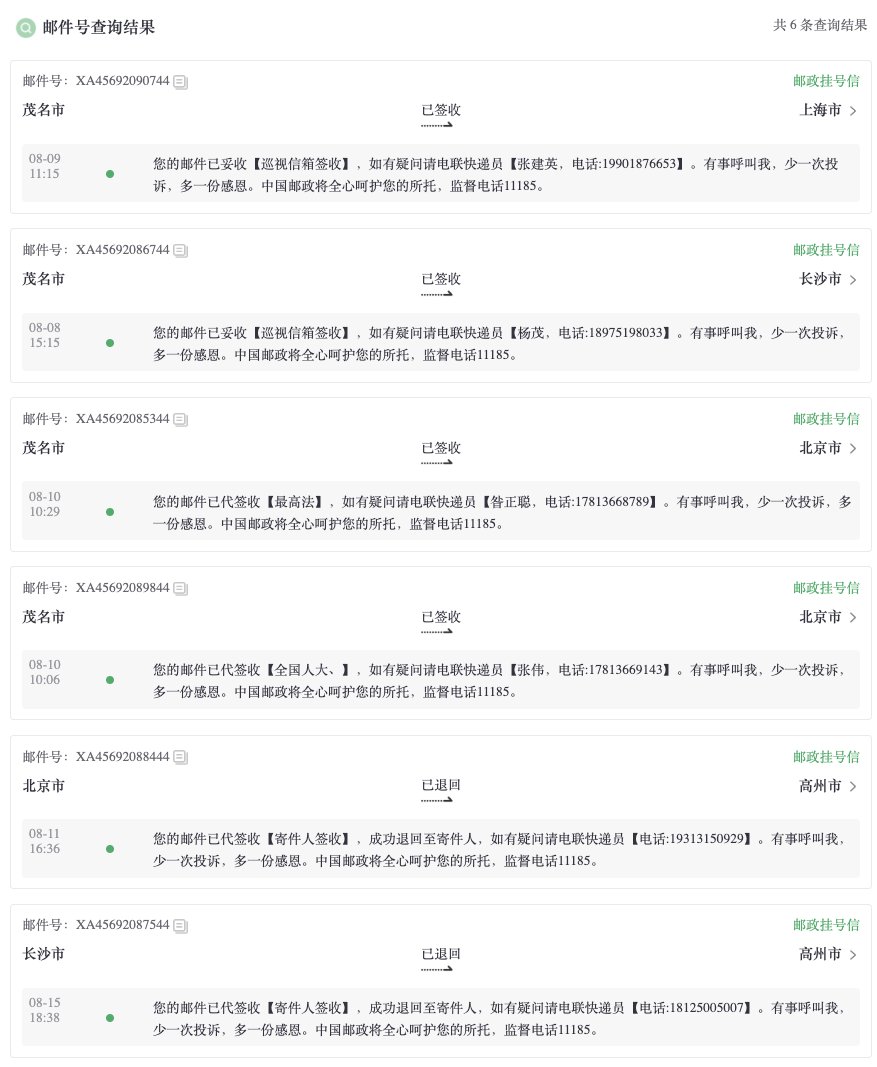 #声援谢阳律师就 #谢阳 案件中的违法行为进行控告,已经收到控告信的单位是:最高人民法院,湖南省高级人民法院,全国人大常委会,中华全国律师协会。司法部和长沙市中级人民法院拒绝接收控告信,并已经退回。怕啥呀,明目张胆违法三年半,现在连一封控告信都怕处理?!