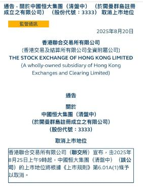 8月20日,恒大退市迎来“终裁”,香港联交所发布公告,由2025年8月25日上午9时起,中国恒大集团(简称“中国恒大”)的上市地位将根据《上市规则》第6.01A(1)条予以取消。
