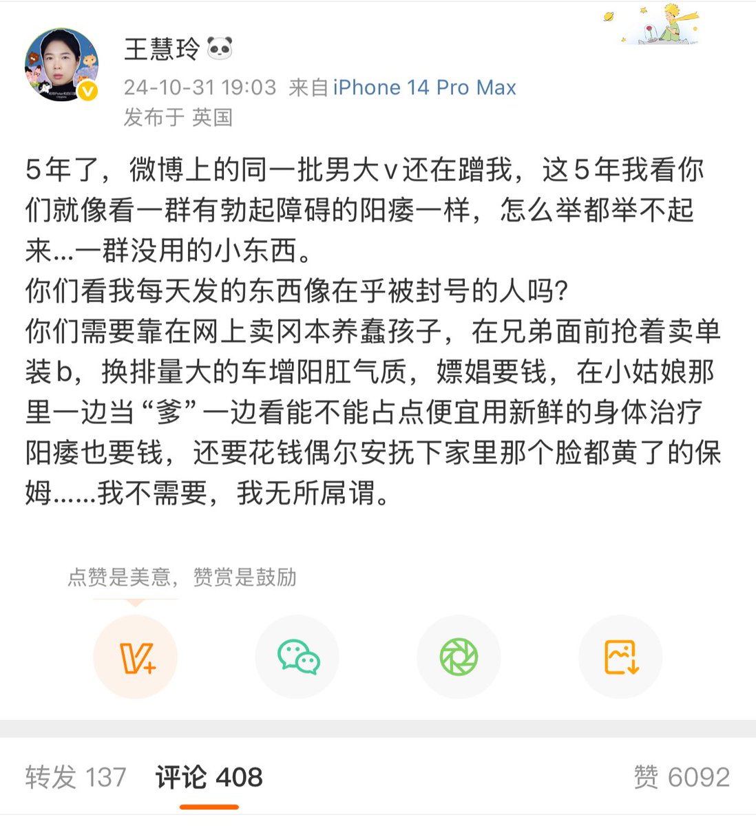 推上骂我的小伙子你们注意点,微博上骂了我5年的冈本六君子一个阳痿,一个糖尿病已经出现全身性并发症(长期久坐在电脑前作恶的福报),而且用来吃“碍国饭”的号还被销了,别说我没有提醒你。
