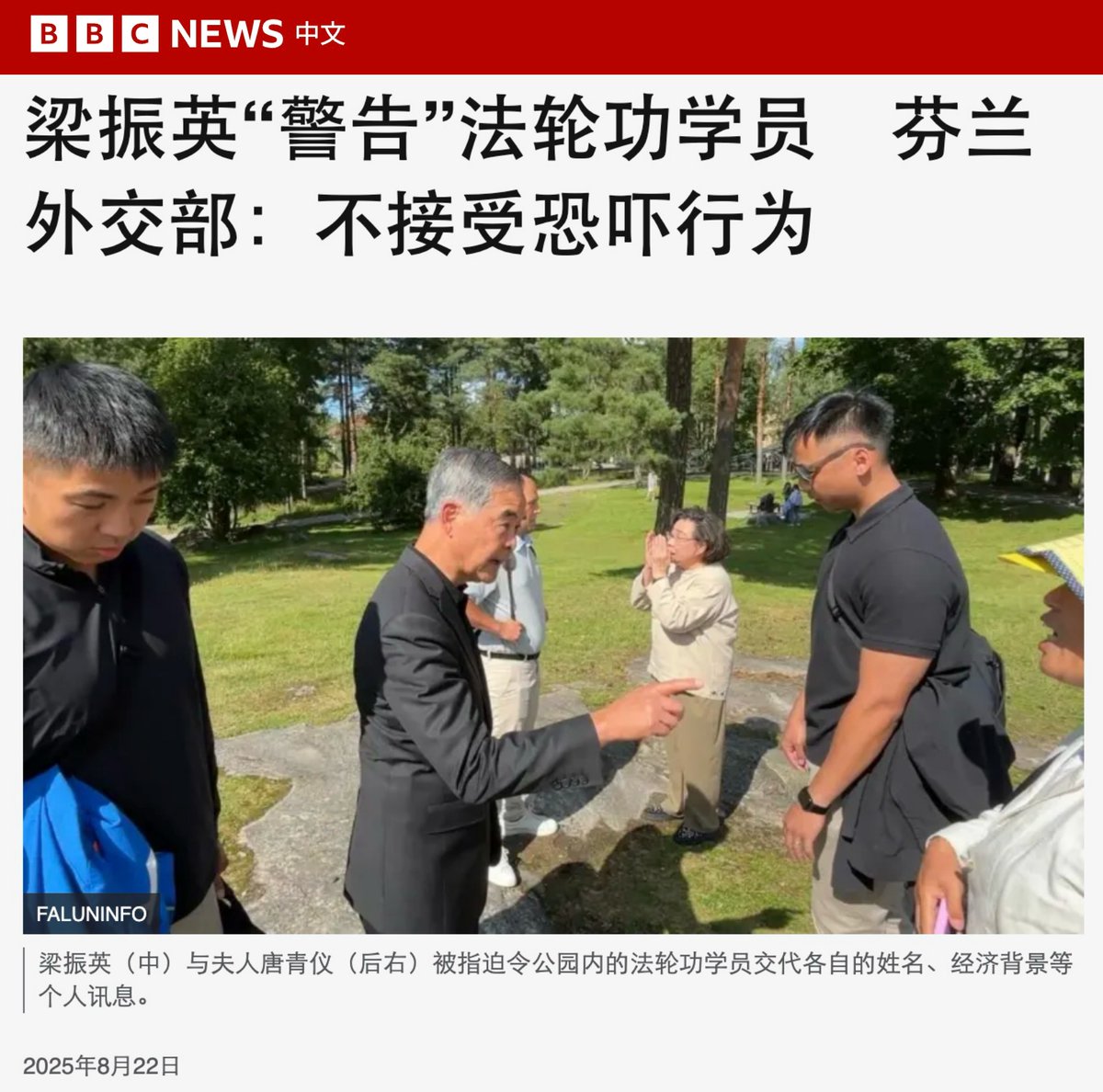 8月22日,BBC 报道:香港前特首、全国政协副主席 梁振英 在芬兰赫尔辛基公园对法轮功学员进行了“公开警告”,称将展开调查。芬兰外交部证实事件确实发生,但表示无法接受任何形式的恐吓行为。对此,法轮功组织回应称,这是“中共跨国镇压的又一例证”。