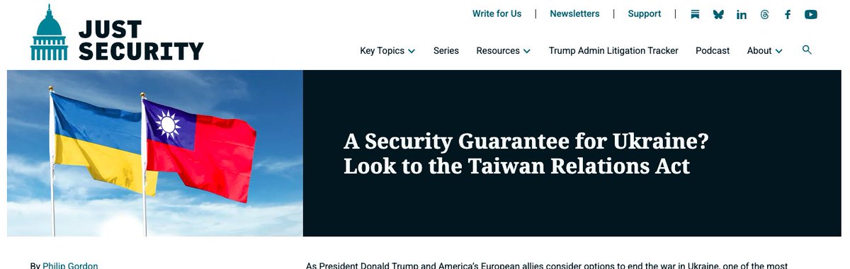 美智库建议援乌仿效《台湾关系法》《Just Security》8月25日发文指出,在北约接纳乌克兰无望、美欧不愿直接对俄开战背景下,可借鉴1979年《台湾关系法》模式:不承诺出兵,但提供武器、训练、情报,助乌建立强大国防,形成“战略模糊”威慑。