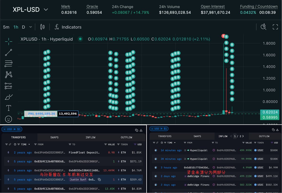 这次是冲着 $XPL 套保大军来的🤯事情经过很清楚了:地址 0xb9c...6801e 自 05:35 起在 Hyperliquid 上做多了数百万枚 XPL,直接扫空了整个订单簿,挤压全部空单(主要都是 1x 套保单),仅仅一分钟就赚了 1600 万美元补充一些其他数据👇1️⃣ 他的资金来源主要可以分为两部分:地址 0x5dE...c03c3