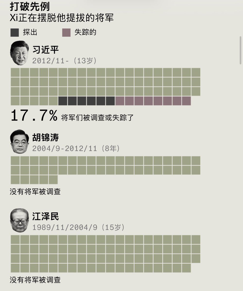 中国的高级军事官员,已经成为中国犯罪份子的聚集地习近平任上提拔的高级别军事官员已经有17.7%失踪或者被调查