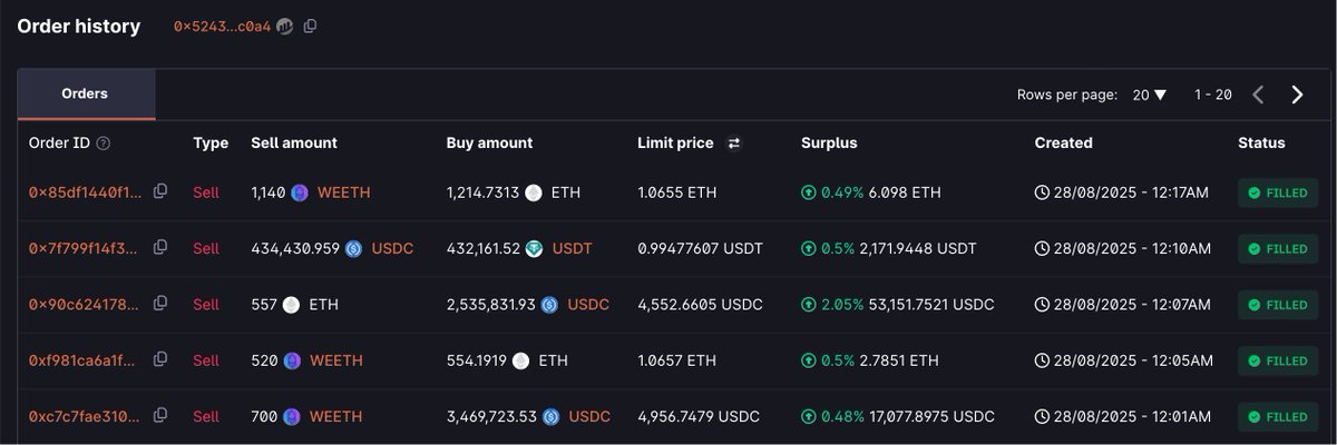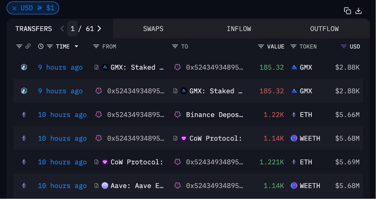 0xinfini 创始人 Christian( 10 小时前疑似抛售 2477 ETH(1166 万美元),几乎卖在了昨晚最高点其中 1257 枚通过 Cowswap 以均价 $4,777.6 卖出,另外 1220 枚充值进了 #Binance,本次若卖出则该地址已清仓 ETH钱包地址本文由 #Gate 大门交易所 |