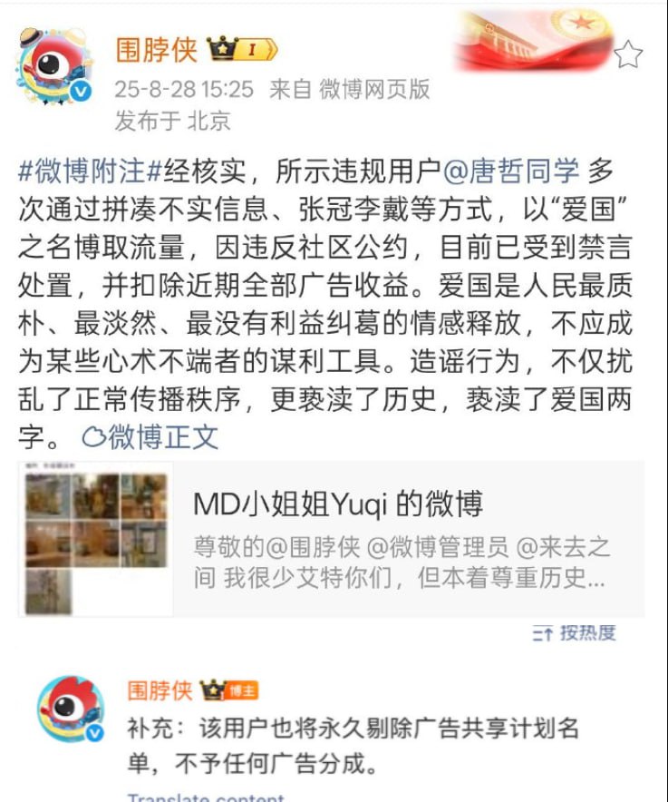 8月28日,著名爱国大V 唐哲同学 因多次造谣,以”爱国“之名博取浏览,被微博平台禁言,并永久取消广告分成资格。
